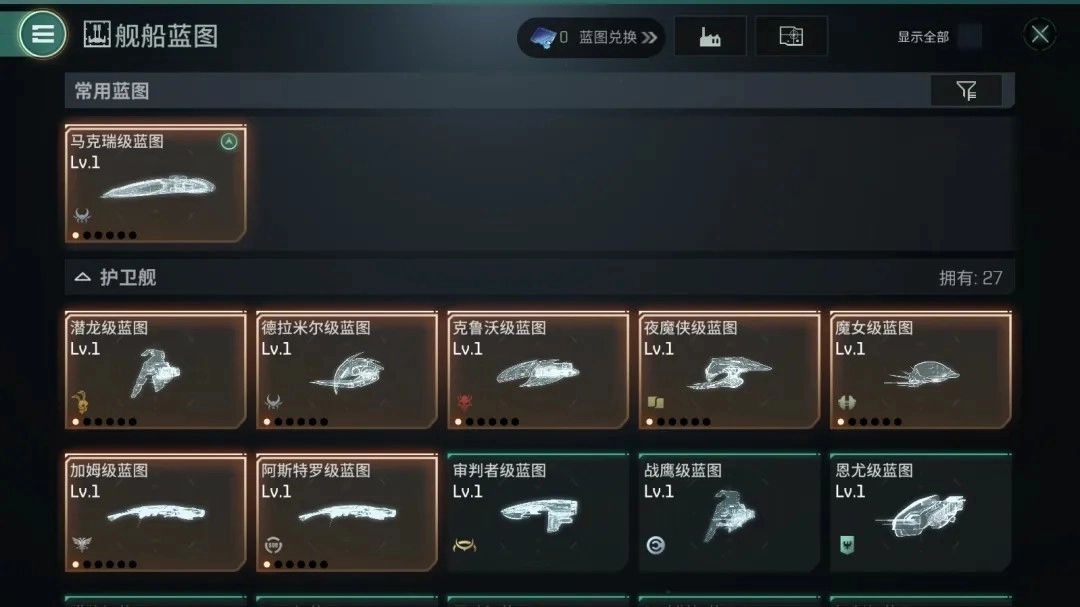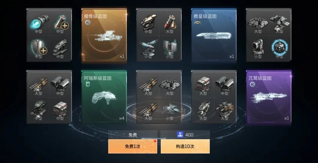 当前的版本中,我们提供了2种蓝图构造方式,“协议知识库”“信用点知识库”。其中“协议知识库”可以获得舰船蓝图和装备蓝图。“信用点知识库”将会主要获得装备蓝图。