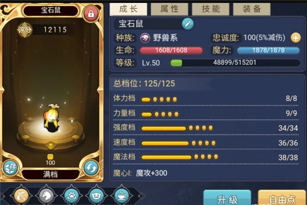 普通玩家在游戏前期挑选宠物时,核心参考标准是属性档位。具体来说,物理输出型宠物要优先选力量属性高的,魔法输出型宠物则重点看魔法属性数值。在150档位之前的阶段,我们建议优先选择满档特效带有输出数值加成的宠物。像125档位的宝石鼠,它本身的魔法档位就处于较高水平,再叠加满档特效带来的魔攻+300加成,能打出相当可观的伤害,用来作为前期过渡宠物是非常合适的选择。至于游戏后期,则可以选择