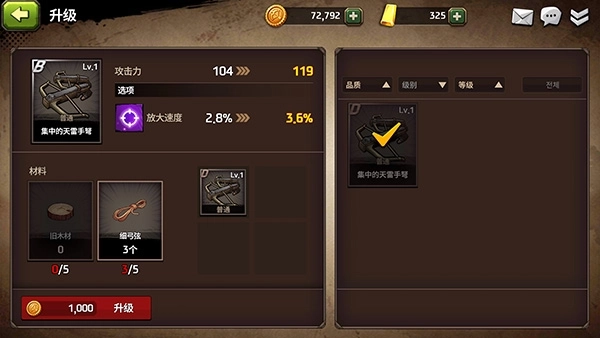 四:在地图准备页面点击英雄管理,可查看装备与武器的属性,还能对武器装备进行升级。在此处的材料栏中,点击选中的材料即可进行合成或分解操作。你的装备等级和属性会直接影响伤害数值的高低。