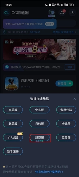 1、安装PUBGMobile体验服之后,使用加速器打开软件,这边建议使用cc加速器,选择新亚服加速进入游戏;