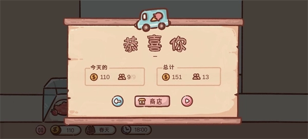 4、一天结束后,你就能看到自己服务了多少顾客,以及赚了多少钱。
