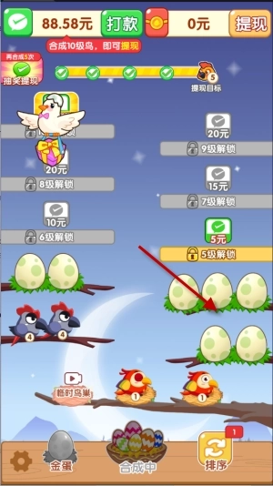 3、灵活运用排序道具与临时鸟巢,能最大程度帮你快速合成高等级小鸟,赚取更多红包!