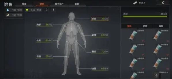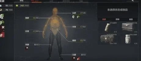 这时身体机能会受到影响。“头部”和“胸部”是撤离失败的损伤部位,因此需要尽快治疗。手臂受损会降低开镜速度与持枪稳定性,物资搜索效率也会大幅下降;腿部受伤会严重减缓移动速度,导致无法奔跑;腹部受伤则会使人无法趴下,还会加速水分和能量的流失。
