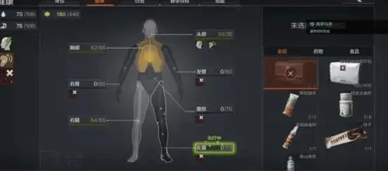 当口袋和弹挂里装有医疗物资时,我们能快速取用,不过这种方式没办法优先选择治疗部位。要是碰到医疗物资紧缺,同时身体又有多处受伤的状况,就可以打开背包,切换到健康界面,针对不同部位分别进行治疗——比如先处理腿部的伤势,让移动能力恢复过来。