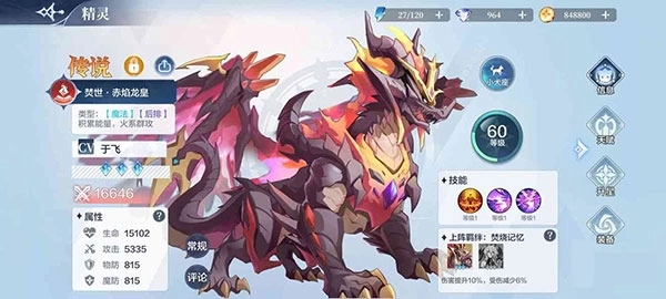 3、被动-真火守护:己方每上阵一名火属性精灵,自身的血量与血量上限均会提升6%,该效果最高可叠加至24%。