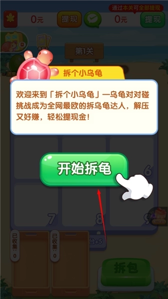 《拆个小乌龟赚钱游戏最新版》是一款当下超火超有趣的休闲合成类手游!在游戏里,遇到颜色相同的小乌龟就能进行合成,合成到一定数量后,不仅能解锁关卡,还能赢取不少游戏奖励呢!玩家可以通过拆包得到各种颜色的乌龟,它们会按特定顺序排列在格子中,只要满足相应条件就能消除并获得积分,达到指定分数就能通关,而且每次通关都能拿到小红包!这款游戏玩法轻松休闲,奖励也相当丰厚!