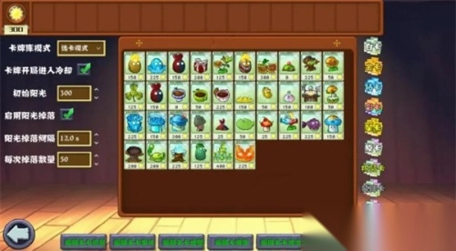 7.玩家点击编辑卡牌库后,可对挑战关卡时能使用的植物卡牌进行编辑,同时也能设置初始阳光数量以及阳光的获取间隔时间。