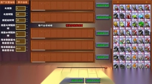 8.接下来点击下一个按钮,即可进入关卡波次的编辑界面,这里可以设置僵尸出现的波次与类型,玩家能够自主选择每行僵尸的出怪顺序以及时间间隔。