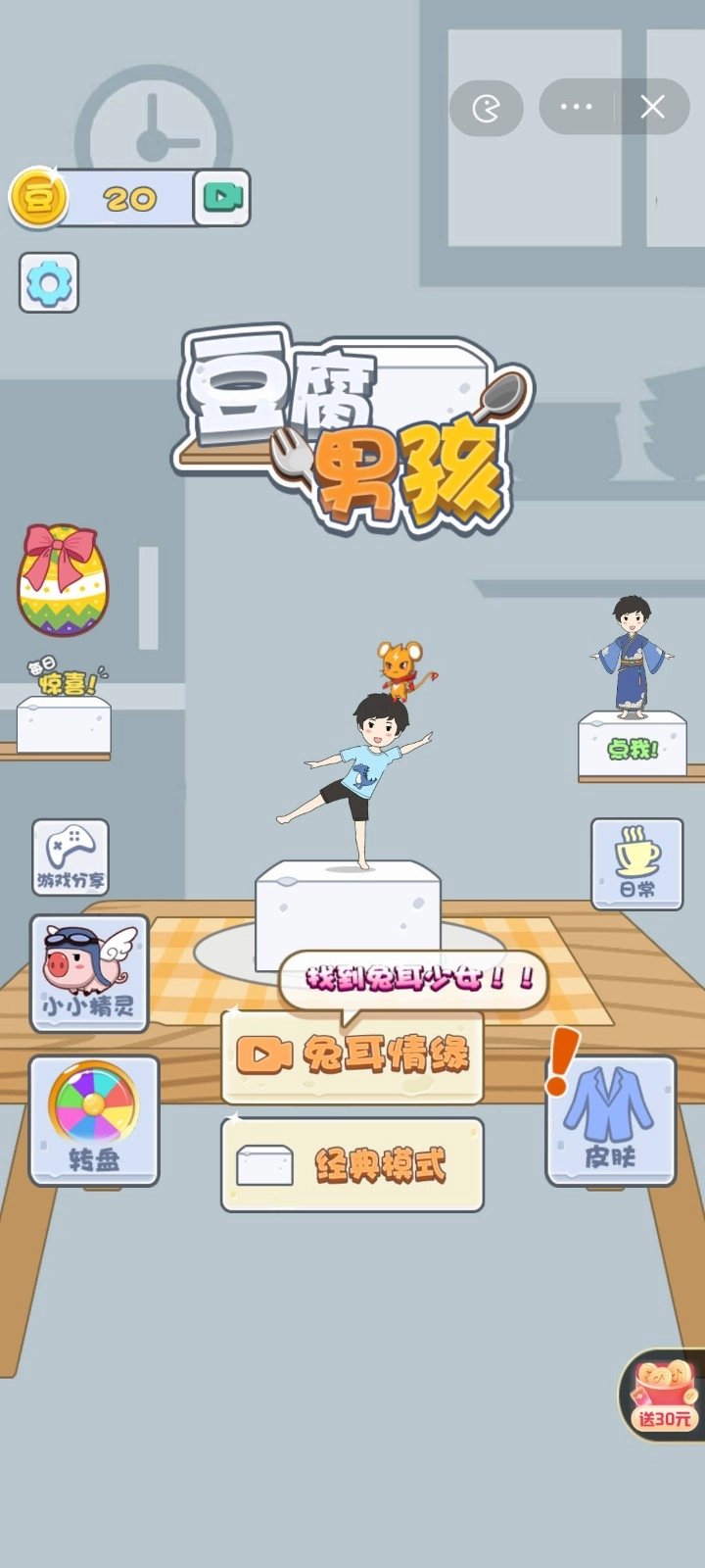萌萌的豆腐小男孩:这款游戏的主角是个可爱的豆腐小男孩,外形简约却趣味十足。玩家能通过解锁各类服装与装饰,让自己的角色变得更具个性。