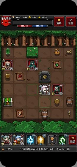进入游戏后,我们会发现自己身处一个房间里,地板上布满了一格一格的方格,这些方格代表着我们行走与攻击的距离范围。首先我们移动到房间内的石门前,接着点击石门,就能进入副本了。