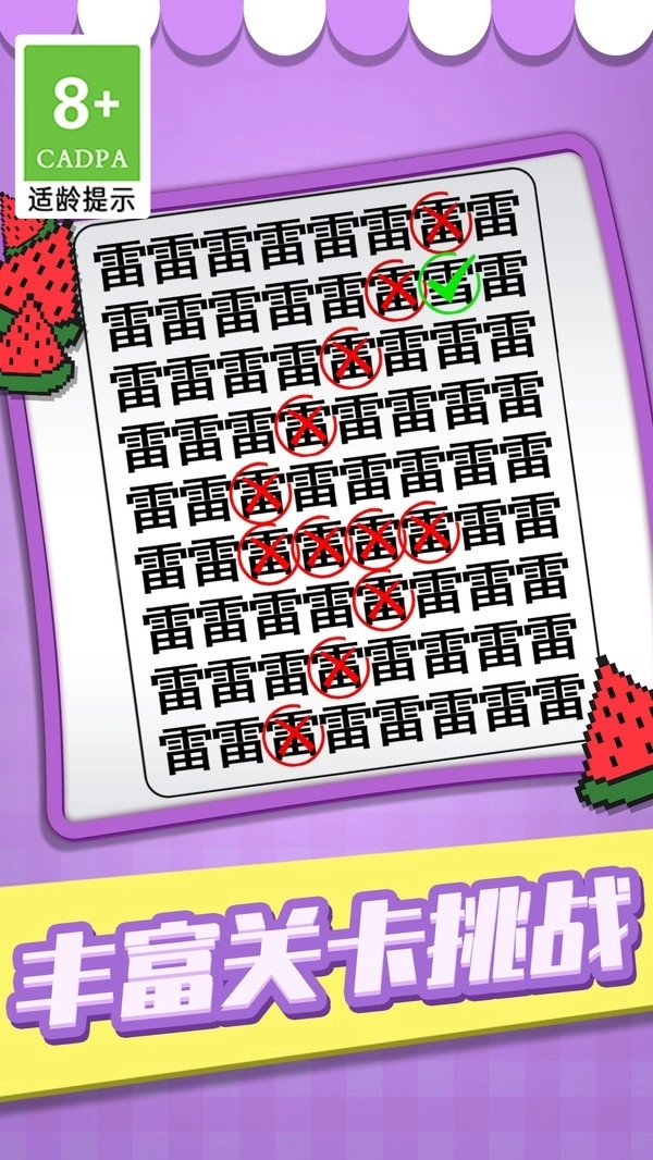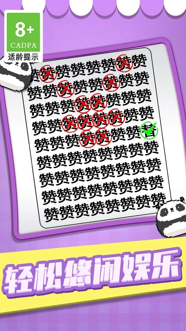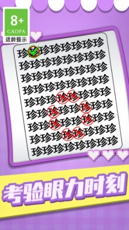游戏里的每一关都布满了密密麻麻的文字,玩起来对玩家的视力和观察能力是不小的考验,你得快速找出不一样的汉字。这里有好几十个可玩的关卡,能让你的体验趣味满满,特别适合在无聊时用来消遣。