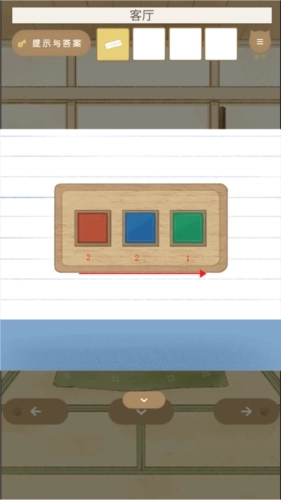 3、把两个【纸条】合并到一起,就能得到线索:红红蓝蓝绿。接着去(客厅)找到柜子,按照从左往右的顺序按下按钮,具体操作是红按2次、蓝按2次、绿按1次。