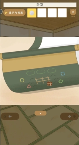 这一章里又新增了两个场景。卧室柜子上的存钱罐里装着100日元,不过这点钱还不够用。卧室左边墙上挂着的绿色卷轴,上面标注了宝藏的位置——顺着侧缘往下走,就能到达田地这个新场景,那里正是藏宝的地方。你得先在田地的右上角找到那把粉色小铲子,接着挖开第三个土堆,就能拿到宝箱了。对了,宝箱的密码就写在绿色卷轴的背面,特别显眼。之后就可以出门去买豆腐啦。