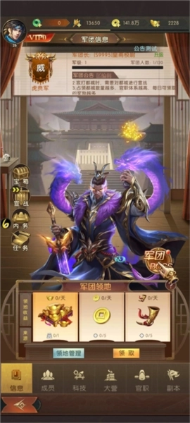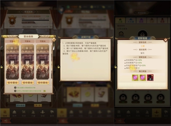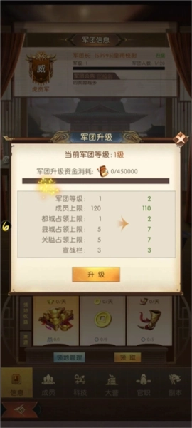 2、军团城战军团长和副军团长可以向已经通关的城池进行宣战,占领的城池越多,每日提供的资源也就越多。军团成员可以派遣自己的部队在军团大营驻扎,以便军团长/副团长调兵至各城池作战。并且首次派遣部队之后即可完成军团签到。占领一座都城之后解锁官职,军团长可以分配成员的官职大小,不同的官职每天可以提供不同的俸禄,占领的都城越多,解锁的官职越高,每日的俸禄也就越高