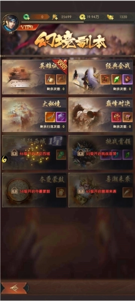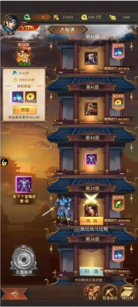 一、爬塔大秘境这个副本的主体是一座不断向上的高塔,主公需要选择最强的一队武将前往挑战,层数越高,关卡难度越大,60层前每过10层,可获得一件紫色品质的装备奖励,60层之后每20层获得装备或者相关道具。