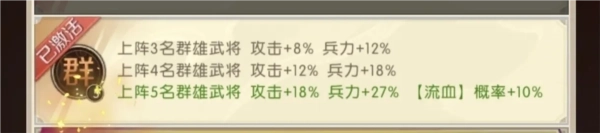3.阵容加成:当队伍中超过3名群雄武将时,每多一名群雄武将都会为队伍增加攻击和兵力,上阵5名群雄武将时还会提高流血概率。