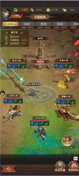 三、圣兽秘境主公在爬塔中获取的装备奖励只有防具类装备,首饰类装备需要在通关爬塔50层后开放的圣兽秘境中获取,圣兽秘境中一共有五只圣兽,对应装备的五个化身,每日主公可以击杀5次化身,次数最多累积10次。