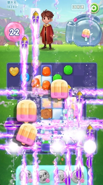 甜蜜导弹会朝正前方发射一道超甜蜜的射线,被这道射线穿过的糖果都能得到加成效果。目前游戏里有三种不同类型的导弹,它们分别能让糖果额外获得1、2、3数量的加成。