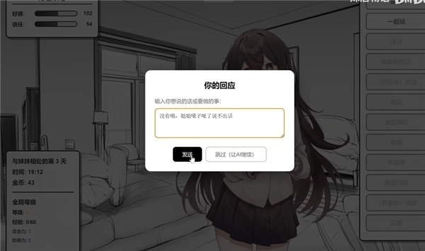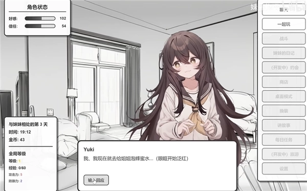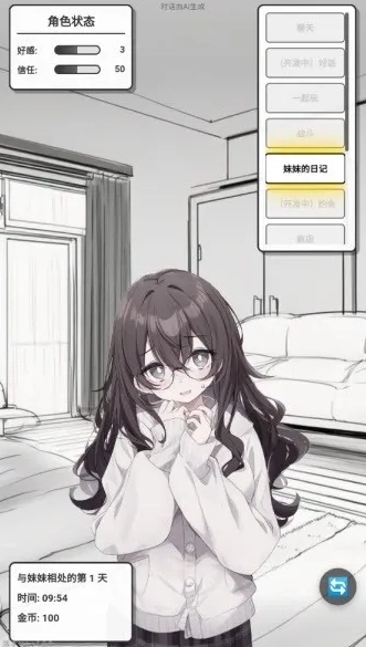 妹居物语MOD菜单最新版本是一款专为喜爱骨科题材的妹控玩家打造的恋爱模拟游戏。游戏搭载了一套极为强大的AI系统,在AI算法的支持下,游戏里的妹妹会逐步掌握各类技能,慢慢成长为性格鲜明、充满真实感的角色——比如她会记住与你的对话内容、你的喜好,以及你日常的习惯。另外,这里提供的版本已解锁相关功能,能为玩家提供,感兴趣的话不妨来体验一番!