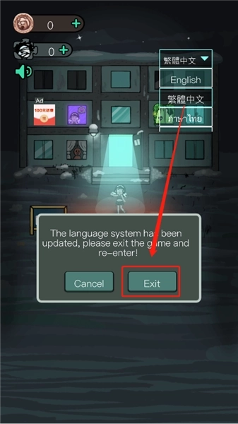 3、切换成功后会出现下图所示的提示,我们需要重启游戏来让语言替换效果生效,点击下图所示的位置还可以快捷关闭游戏。