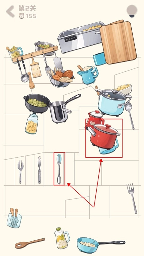 2、将物品按照如图所示位置进行摆放即可过关。