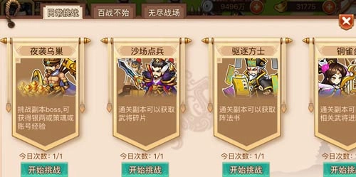 点击游戏主界面的“副本”按钮即可进入副本系统,该系统包含日常挑战、百战不殆、无尽战场三类(具体内容将在副本篇详细说明)。