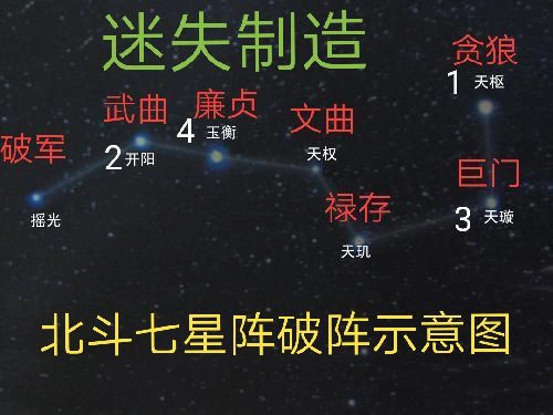 天枢宫贪狼星君、天璇宫巨门星君、天玑宫禄存星君、天权宫文曲星君、玉衡宫廉贞星君、开阳宫武曲星君、摇光宫破军星君。破阵时请留意各星宫的名称,从中找出提示语所指向的四位星君,便能成功破阵,具体可参照图示: